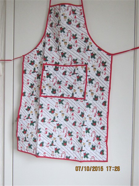 Jul- förkläde, passar både man och kvinna. Egen tyg- design. Material bomull/polyester. Tvätt 40 gr. Tyget finns även som rund duk m röd kant, diam. 150 cm, samt korgduk m volang och grillvante.